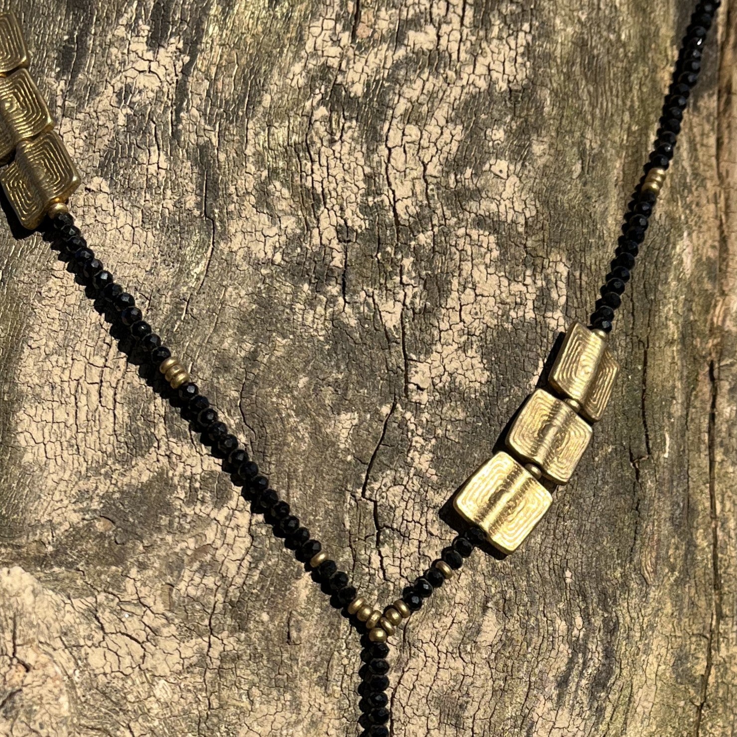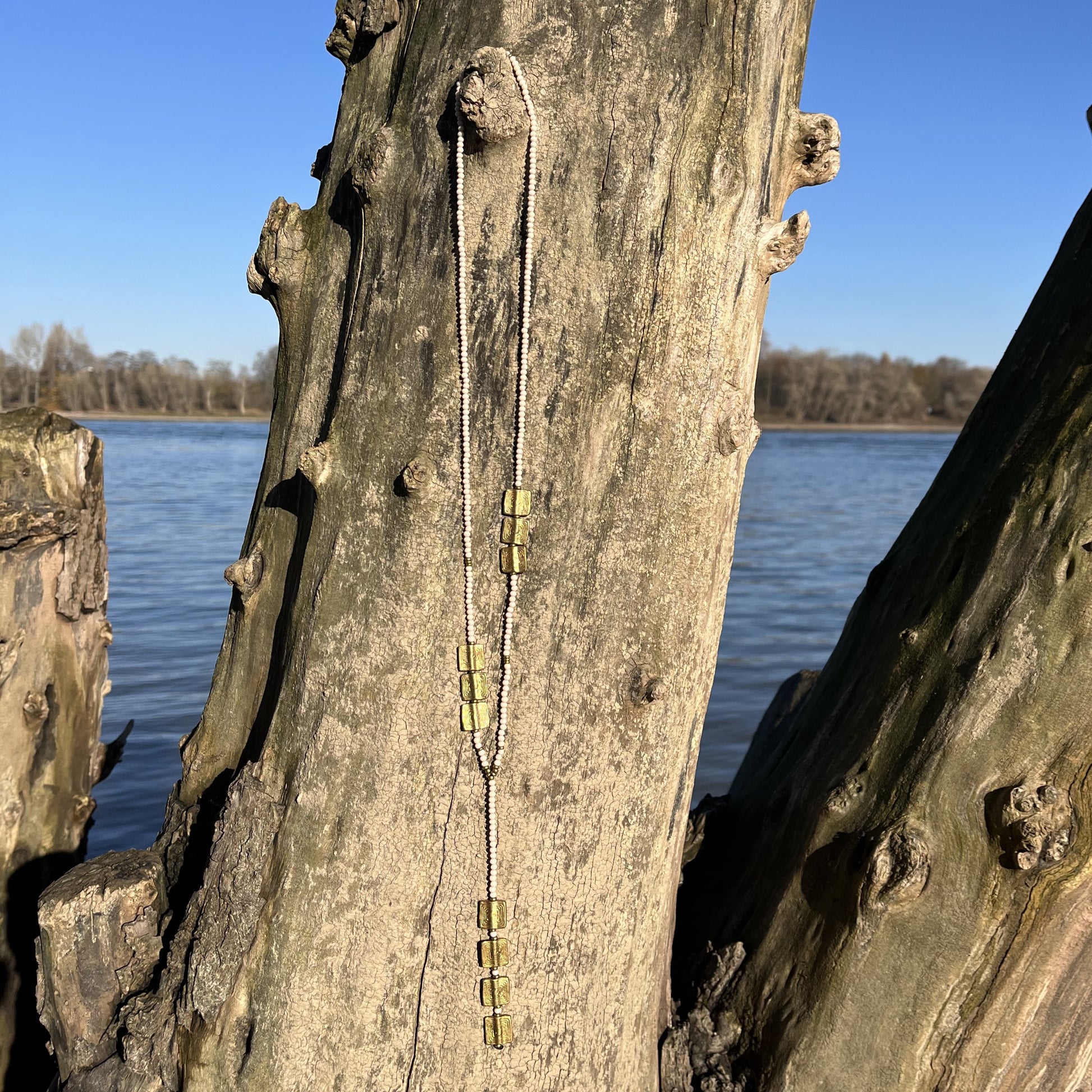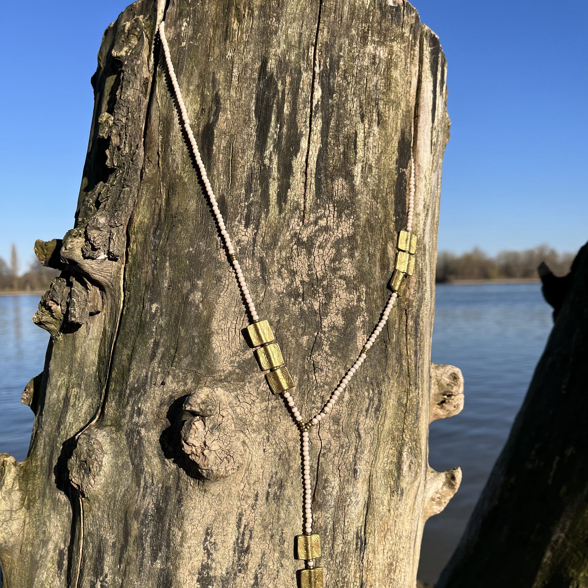 Die filigrane Halskette Earth Square verbindet klare Form mit sanfter Natürlichkeit. Ihr schlankes, asymmetrisches Quadrat-Ornament wirkt wie ein Stück Kunst – inspiriert von traditionellen Mustern.