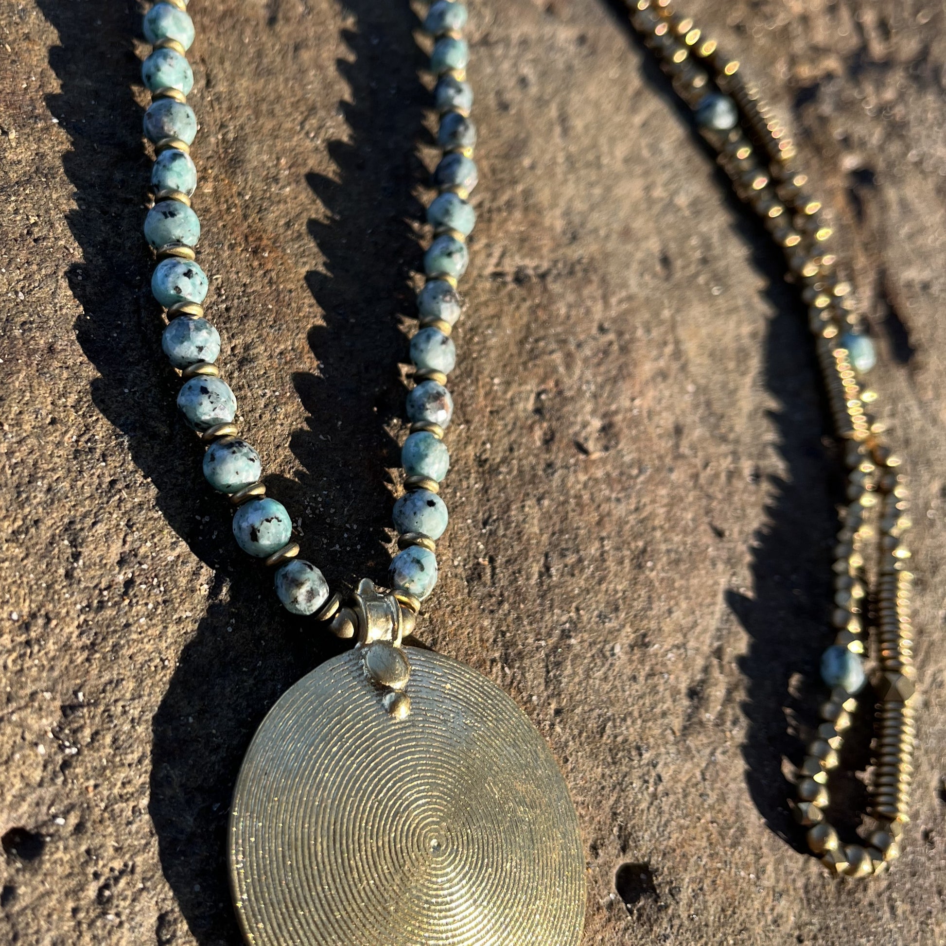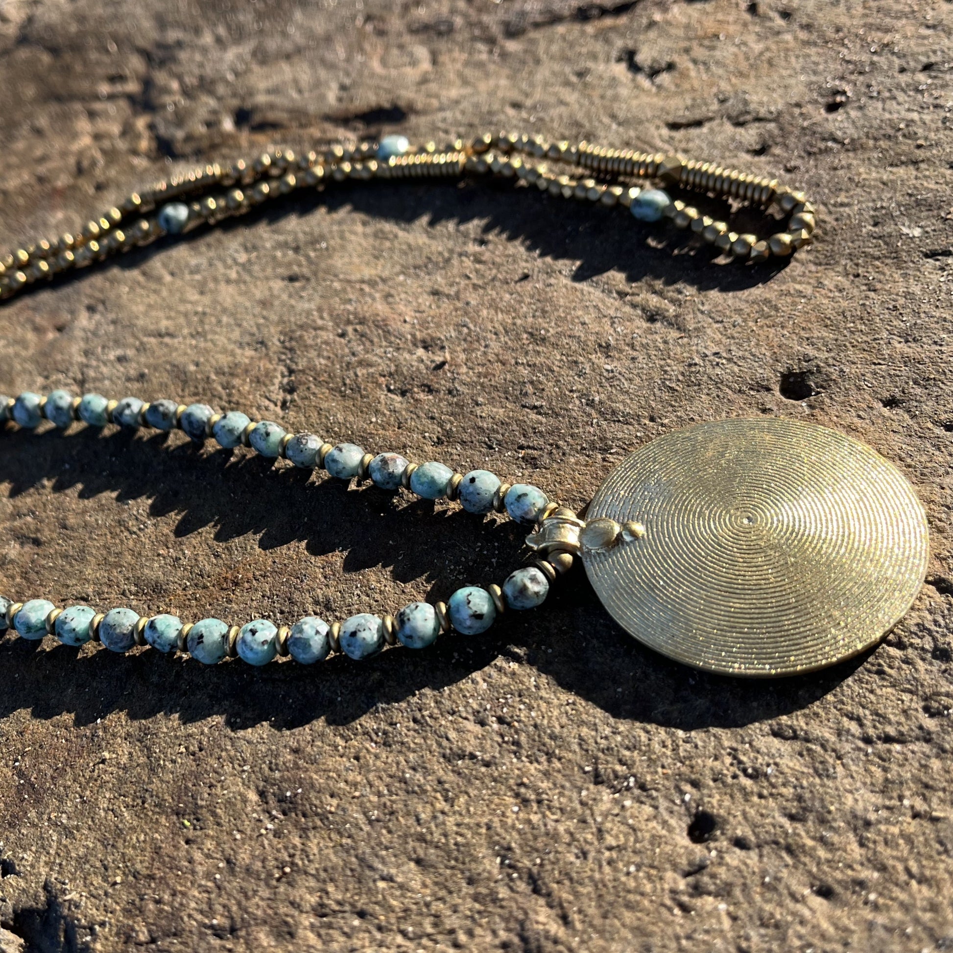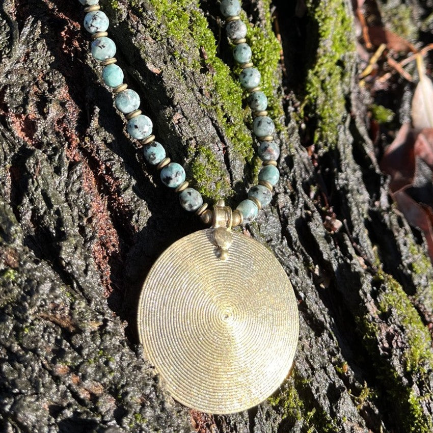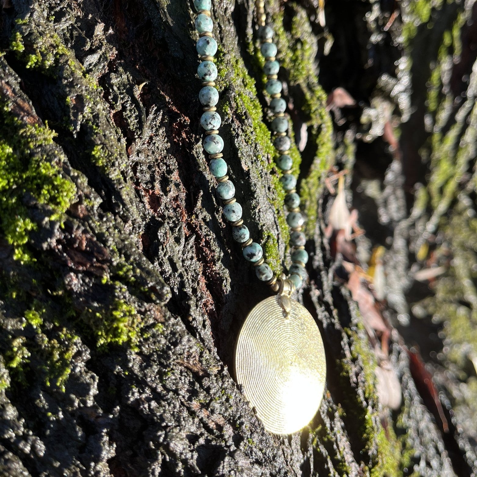 Die ausdrucksstarke Statement-Kette Halskette Eternity Spiral Türkis vereint die schützende Kraft des echten Türkis mit der symbolischen Tiefe einer handgefertigten Spirale aus Messing und Eisen. Die Spirale – ein uraltes Zeichen für Wachstum, Lebensfluss und innere Klarheit – verleiht ihm eine besondere spirituelle Präsenz.