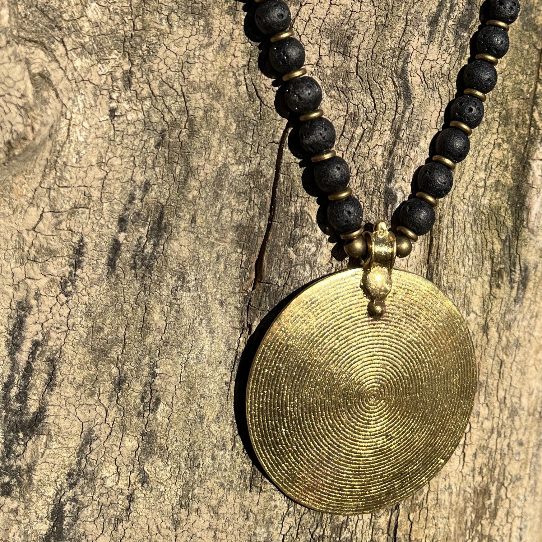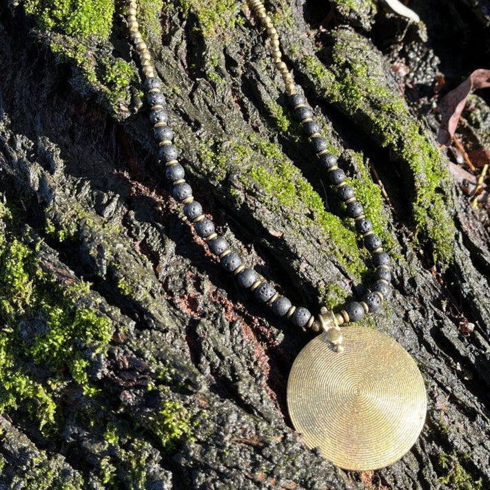 Diese markante Statement-Kette Halskette Eternity Spiral Lava verbindet die ursprüngliche Kraft des Lavasteins mit der symbolischen Tiefe einer handgefertigten Spirale aus Messing und Eisen. Die Spirale – eines der ältesten Symbole für Wachstum, Wandlung und Lebensfluss – bildet das Zentrum dieses besonderen Schmuckstücks und verleiht ihm eine geheimnisvolle, erdende Energie.
