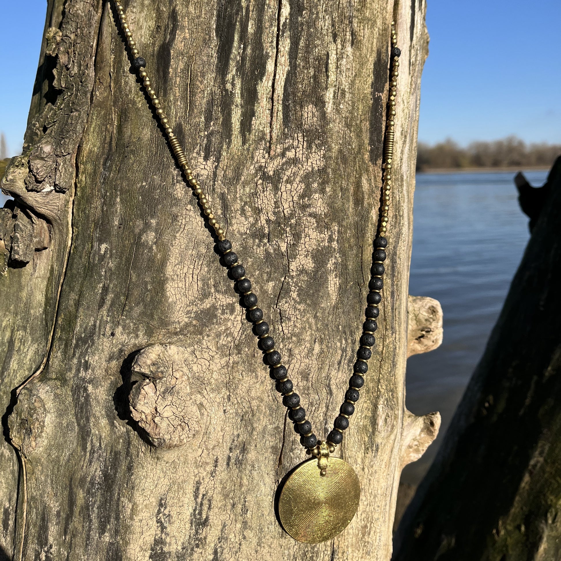 Gemeinsam mit dem warmen Goldton des Messings entsteht ein faszinierender Kontrast: rau und kraftvoll trifft auf elegant und zeitlos. Jede Kette wird sorgfältig von Hand gefertigt und besitzt ihren eigenen Charakter – perfekt für Frauen, die authentische, spirituelle und kraftvolle Schmuckstücke lieben.